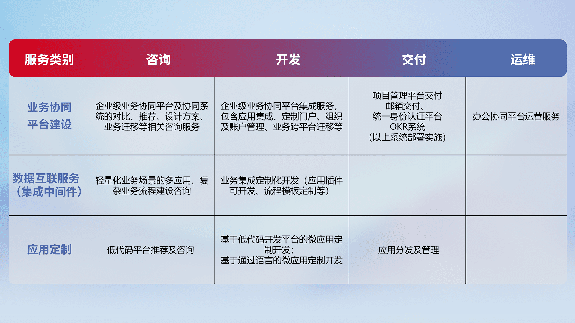 针对钉钉、、企微、、、IDaas等平台级产品提供产品的规划、、方案、、、交付、、、、定制化开发等服务,,,,实现如统一协同办公、、智能客户服务、、、混合会议管理、、、、智能数据查询、、等业务场景,,,,实现数字化转型。。。。