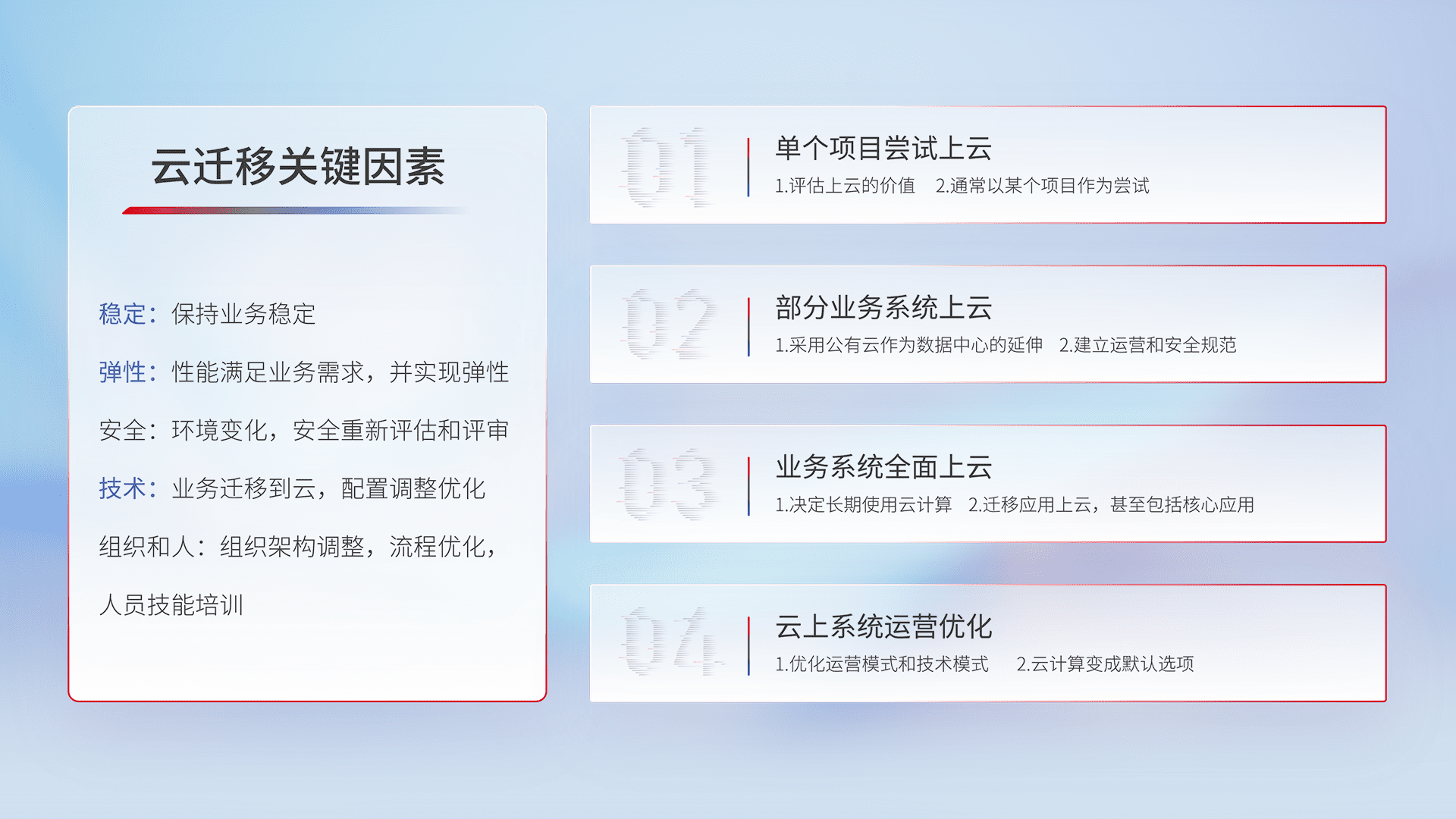 结合实际业务,,,从规划设计、、、、云平台选型、、、、云原生改造、、、数据迁移、、、、集成交付,,迁移全过程为客户识别最佳上云路径,,做好风险识别管理,,,设计网络架构、、、、身份权限、、、安全审计合规、、、操作审计、、、、日志审计、、监控告警策略、、多站点容灾设计等,,对云上基础设施进行整体规划,,提升IT治理水平,,,以满足弹性、、高可用、、高性能的需求。。。