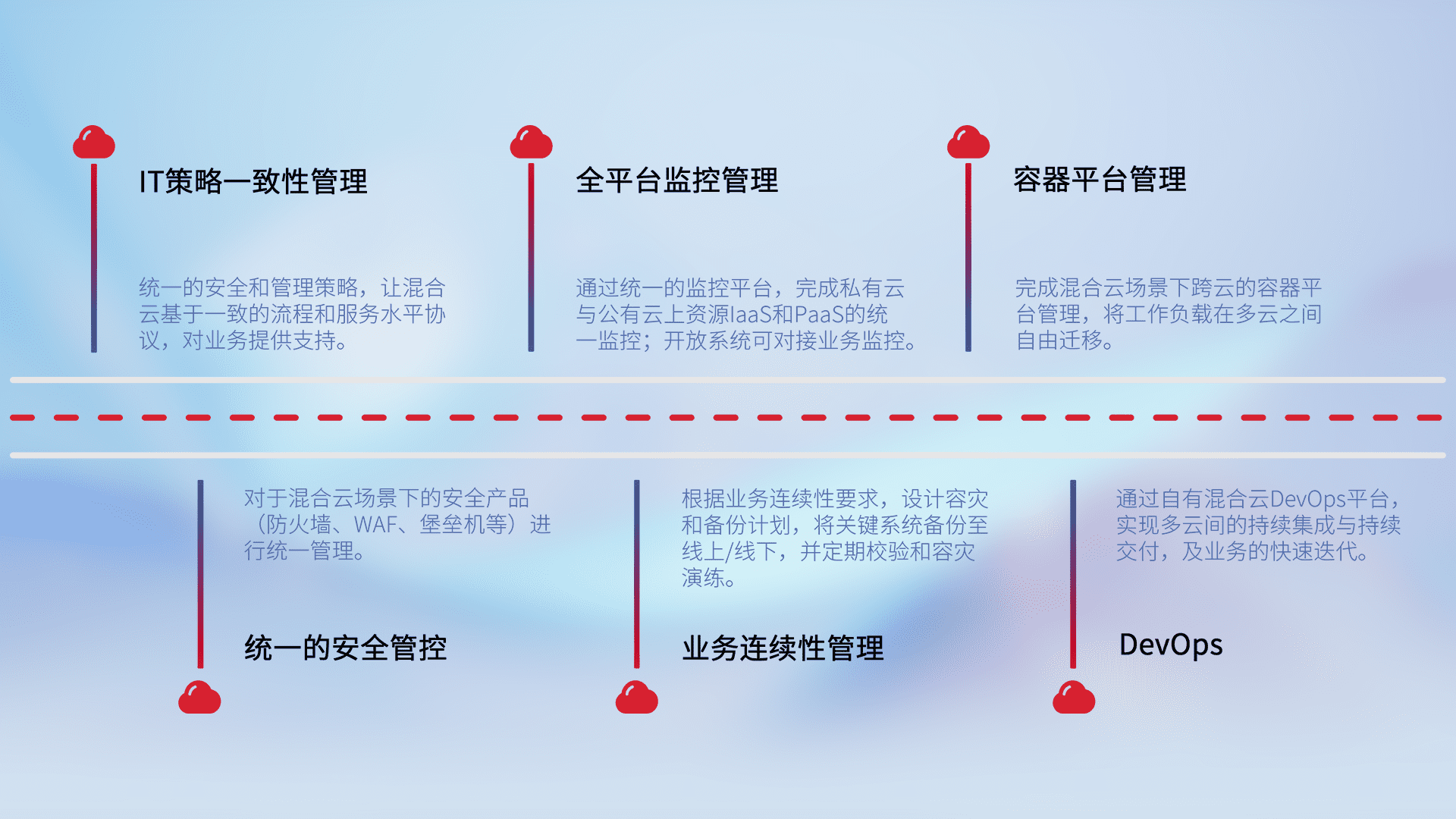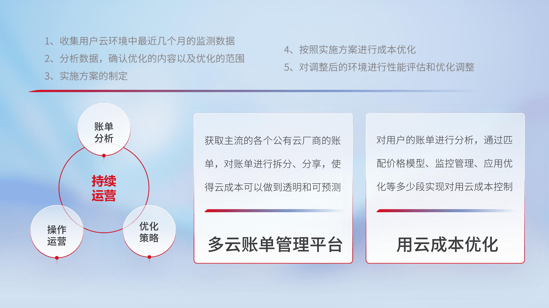 通过多云纳管,,,以统一的资源数据模型把客户的云资源进行抽象和封装,,进而实现对多云资源的统一操作,,,保障云资源管理的可靠性、、、稳定性与可用性。。量身定制化运维内容,,,,配置、、开发运维、、、补丁管理、、、备份、、、、监控、、、认证和访问管理、、审计和日常巡检等,,保障在用云过程中的可靠度,,,,稳定度以及高可用率。。
